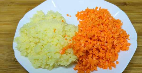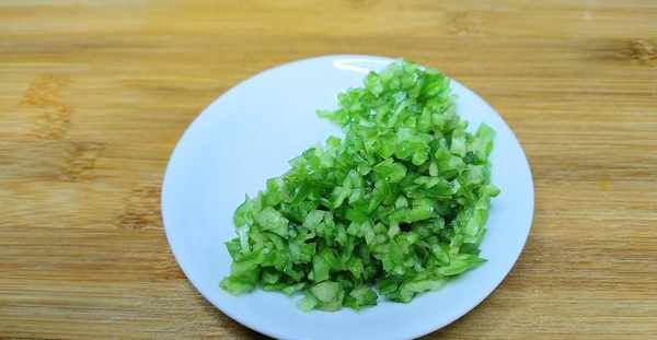 下面在準備一個土豆,土豆去皮之後先切成薄片,然後在切成細絲,最後在切成土豆碎,切的差不多就行,沒有太多的要求,切好之後先裝入一個盤子裡面,胡蘿卜在來一根,洗凈去皮之後先切成薄片,最後在切成胡蘿卜碎,切好之後與土豆碎放入一起,下面在來一個青椒,先切去根蒂不要,在切成細絲,這個青椒沒有辣味,加入一根青椒既能提色又能增加一些營養,最後在切成青椒碎,切好之後單獨放入一個小盤裡面