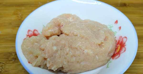 首先準備一塊雞胸肉,先給它切成薄片,如果不喜歡吃雞胸肉朋友們,也可以使用豬肉來代替,然後在剁成肉沫,剁的稍微碎一些,這樣吃起來的口感也會更好一些,如果不喜歡手工剁,也可以使用絞肉機來處理一下,雞胸肉剁好之後先裝入一個小碗裡面。