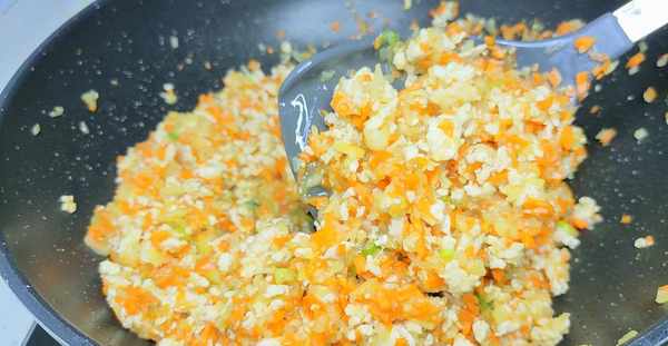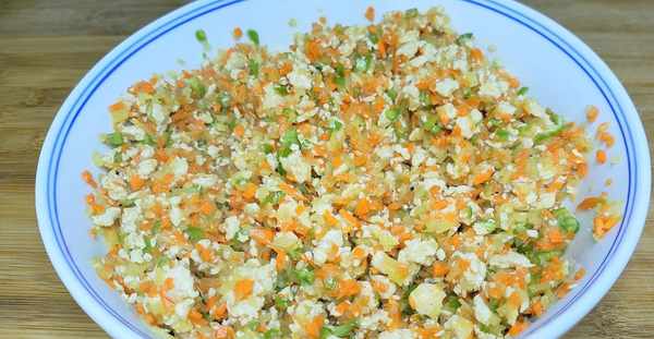 接著鍋中加入一點食用油,油熱之後把雞胸肉倒入鍋中,然後開啟小火翻炒一下,把雞胸肉炒勻滑散,炒制變色之後把蔥薑倒入進來,土豆胡蘿卜也倒入進去,下面開啟大火翻炒一下,把裡面的食材都翻炒均勻,在這裡建議大傢,土豆胡蘿卜盡量的不要去焯水,就這樣翻炒一下,裡面的營養也能更好的保留,翻炒兩分鐘左右來調個味,加入一勺食鹽,半勺雞精、一點點胡椒粉、一點生抽醬油、下面開啟大火再次的翻炒一下,把裡面的食材全部炒熟,這樣也方便下一步法的操作,現在的餡料也已經翻炒熟瞭,看著也是很有食欲,下面關火,把餡料先盛入一個大碗裡面。