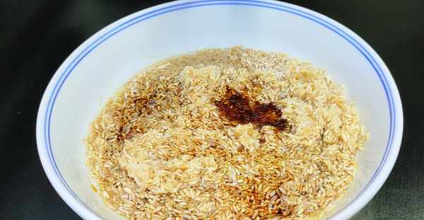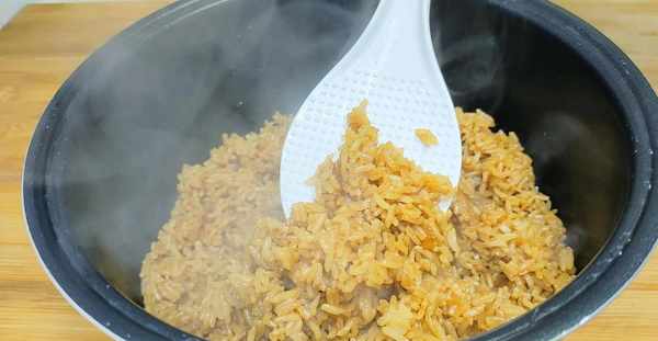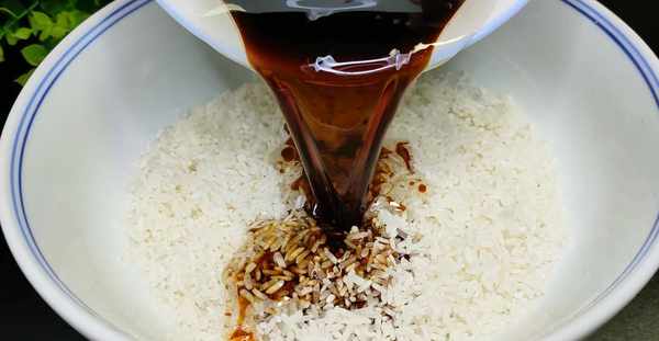 下面的大米也已經泡好瞭,然後把醬油倒入大米裡面,接著在加入一點清水,水的量與大米一比一的深度就可以瞭,下面使用勺子攪拌一下,攪拌均勻,攪拌好之後放入電飯鍋裡面,接著蓋上蓋子,按煮飯鍵蒸30分鐘。
