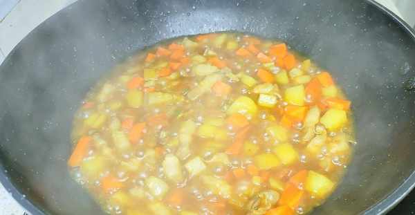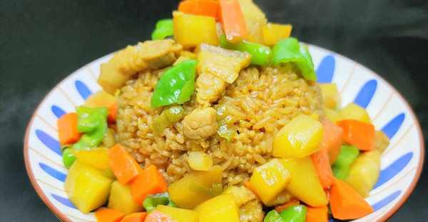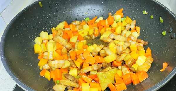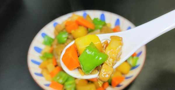 下面鍋中加入一點食用油,油熱之後把五花肉倒入鍋中,然後開啟中小火翻炒一下,把五花肉中的油脂都煸炒出來,這樣吃的時候也不會油膩,同時煸出來的油脂炒出來的菜會更香,一直煸炒到焦黃後在把蔥薑加入進去,再次開啟小火翻炒,炒出小料中的香味,炒香後在把土豆胡蘿卜加入進來,下面開啟大火翻炒一下,把裡面的食材都翻炒均勻,下面來調個味,加入一點生抽醬油、一點老抽調個顏色,加入半勺食鹽,半勺雞精、一點點十三香或者五香粉,最後在加入一塊咖喱,然後開啟大火翻炒一下,把裡面的調料都翻炒均勻,大概翻炒兩分鐘左右在往裡面加入一碗清水,下面蓋上蓋子,改為中小火燜煮5分鐘。五分鐘過後打開蓋子來看一下,接著把青椒倒入進去,再次的開啟大火翻炒一下,把青椒炒至斷生,一直把裡面的湯汁收至濃稠就可以瞭,現在看著就很有食欲瞭,下面先把火關掉放一旁備用。