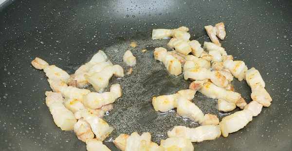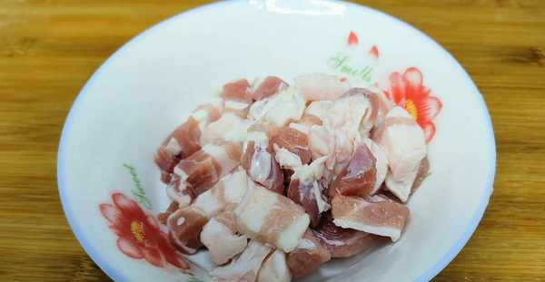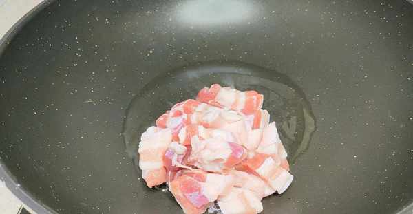 在來2塊錢的五花肉,先切成薄片,如果不喜歡吃五花肉也可以使用瘦肉或者牛肉來代替,做這道美食盡量選用五花肉,這樣吃起來會更香,最後在切成小肉丁,切好之後放入一個小碗裡面,下面準備一個小碗,往裡面加入一點食用油,在加入一勺生抽醬油,在加入一點老抽調個顏色,下面使用勺子攪拌一下,把裡面的醬油攪至均勻,攪勻之後先放一旁備用。