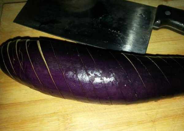 茄子斜切厚片,不要切斷(可在下面墊筷子)。這一步非常關鍵,直接影響到菜品的顏值呢!