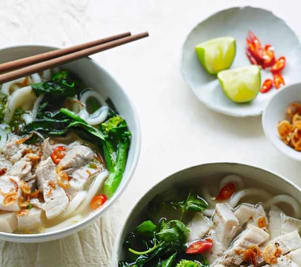 根據包裝說明煮面條。將面條放入碗中,然後放上香菜,蔥,香蔥和辣椒。添加魚餅(如果使用),再加上五花肉片,並用一些精選的葉子和黑胡椒調味料裝飾。準備食用時,將肉湯燒開,將其澆在內容物上。擠壓大量的檸檬汁,並在需要時與魚露一起食用。