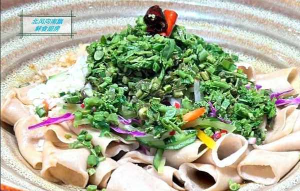 所需食材:香椿,莜面,黃瓜,胡蘿卜,紫甘藍,鹽,雞精,生抽,白糖,醋,香油,幹辣椒,蒜,蔥花