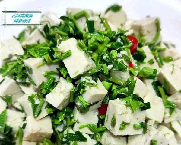 2 豆腐焯水,切成小丁,放入碗中,加鹽,雞精,香油,各一勺,幹辣椒熱油爆香倒入,拌勻即可。清爽美味傢常小菜。