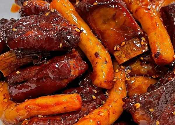 4.然後大火煮開,接著轉中小火燉煮30分鐘,再放入年糕,繼續燉煮五分鐘煮熟,最後撒入一把白芝麻,大火翻炒收汁,即可出鍋開吃。