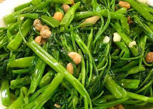 3.炒至空心菜斷生後,再加入一勺花生油作明油,繼續翻炒均勻,即可出鍋開吃。