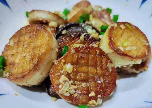 1.剛買回來的杏鮑菇,先用清水清洗兩遍,瀝幹一下水分。然後再用菜刀將杏鮑菇切成圓片,可以切稍微厚一點,再用改刀法將圓片的正反兩面都劃十字刀,切好瞭放在一旁備用。
