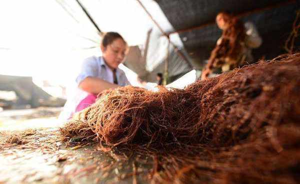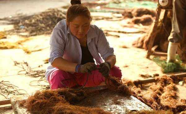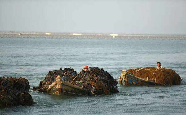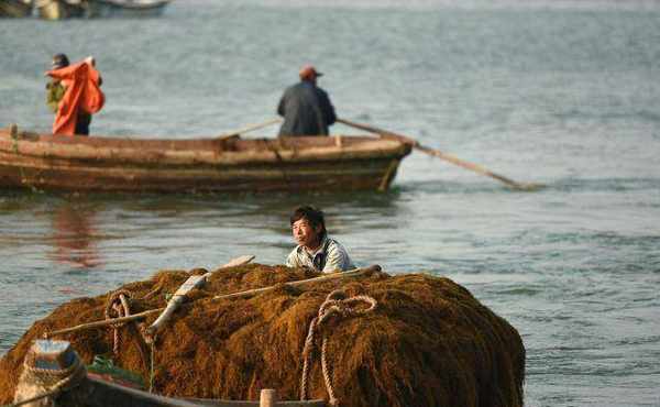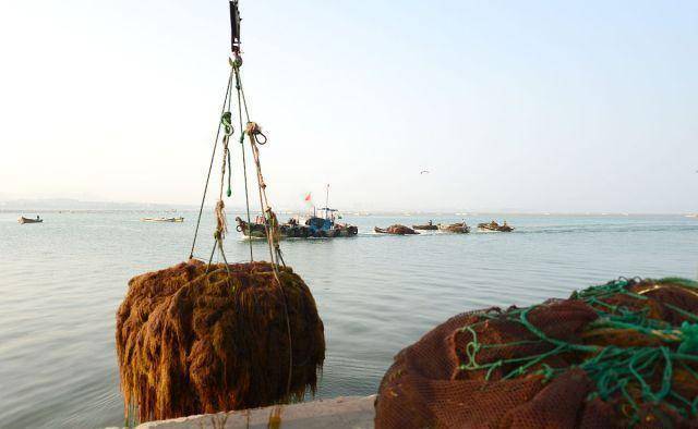在山東省威海市榮成市桑溝灣一傢碼頭,這裡的漁民正在往繩架上夾龍須菜苗,送到海裡養殖。