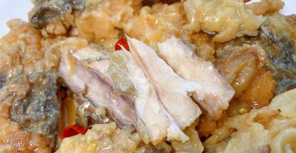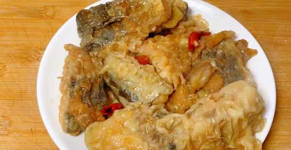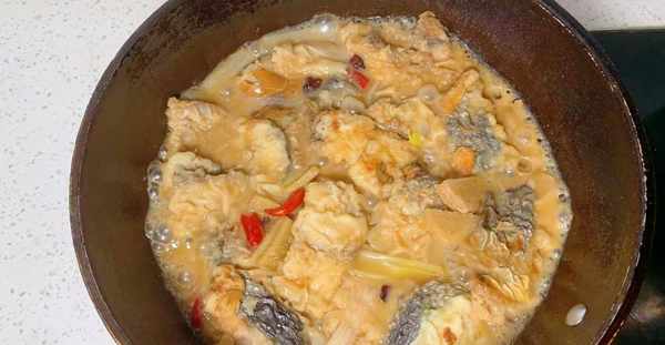 2、把鍋中炸魚的油倒出來,留一點底油,再把炸過的鮁魚倒入鍋內,接著倒入一碗清水、3勺陳醋、2勺味極鮮、少許白糖、鹽、小米辣、八角、薑皮、大蒜、倒入500毫升的啤酒去腥、蔥段,把鍋蓋蓋上煮開後,再轉為小火燉15分鐘,中途一定要用鏟子不停的往魚身上澆湯,晃動一下炒鍋,使魚肉更入味。15分鐘後關火,把魚肉盛入盤內即可。