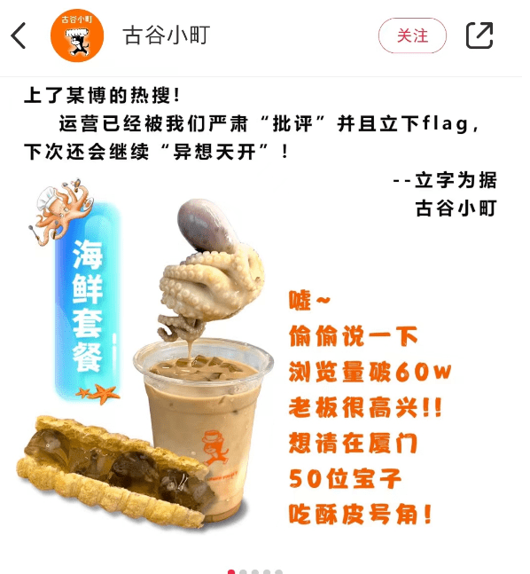最近的章魚拿鐵,據爆料的小紅書賬號“古谷小町”透露,產品更是火爆出圈,僅小紅書就引發瞭60萬+的瀏覽量。