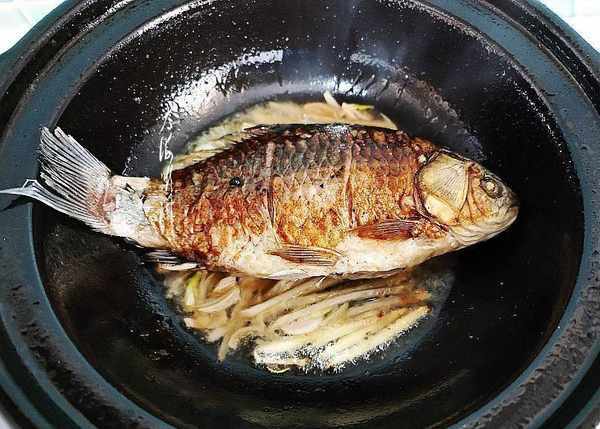 砂鍋中加入適量的油,爆香幾棵花椒粒,取出扔掉。鯽魚兩面打花刀,放入鯽魚兩面煎至金黃取出備用。