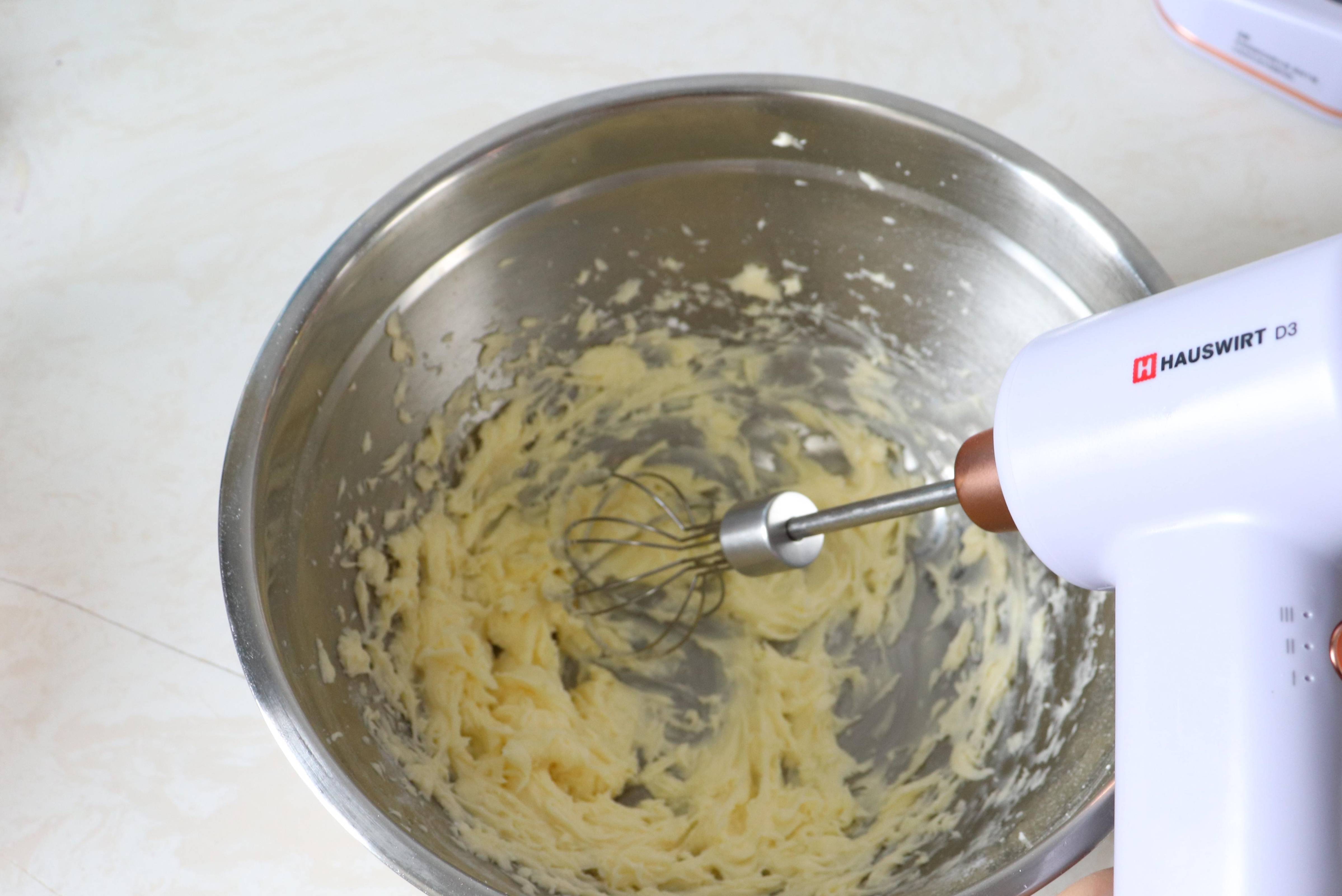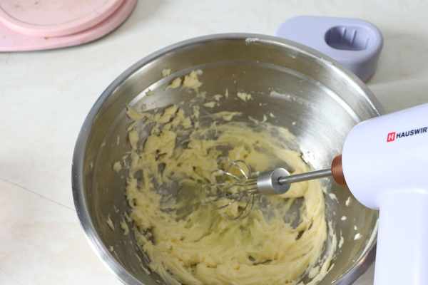 黃油軟化加入糖粉,刮刀壓拌幾下,用打蛋器攪打幾下