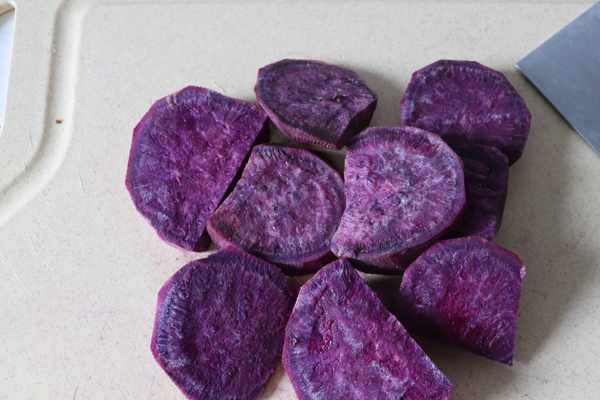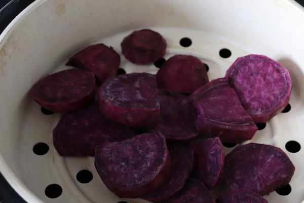 具體制作步驟:準備好所有食材並稱量好備用,紫薯去皮,切片,放入蒸鍋中蒸熟,壓成紫薯泥