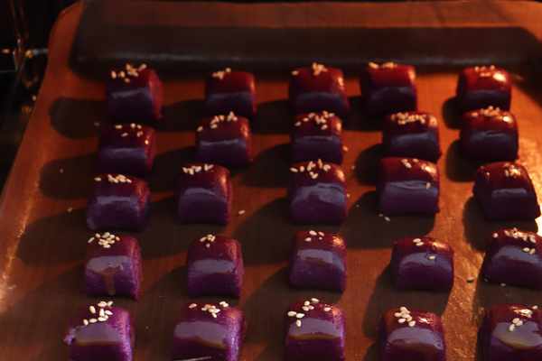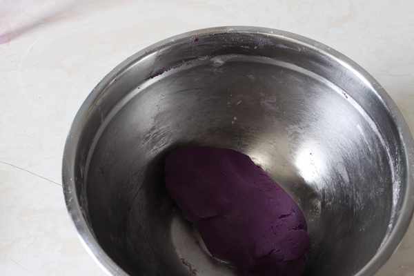 紫薯泥放入奶粉,煉乳,加熱成液體的黃油,揉成團,冰箱冷藏