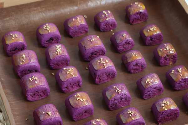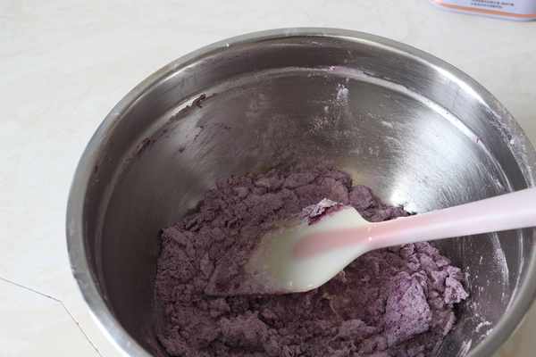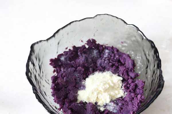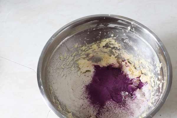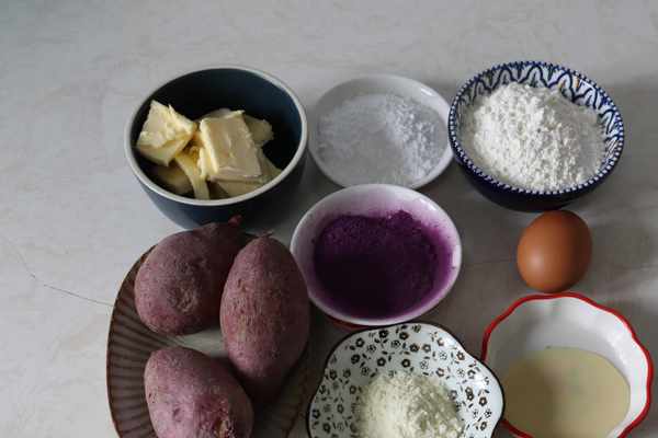 所需食材:外皮:低筋面粉:100克,蛋白:25克,紫薯粉:10克,黃油:58克,糖粉:35克餡料:紫薯泥:185克,黃油:25克,煉乳:12克,奶粉:10克