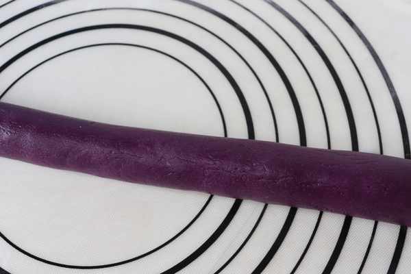 取出酥皮,搟成長條,中間放入紫薯餡料,包裹緊,稍微搓長