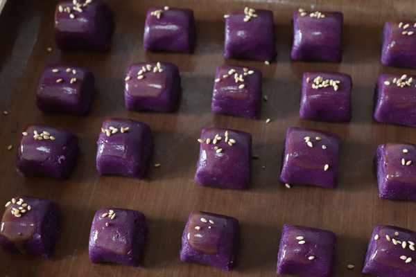 切成小塊,放入烤盤中,表面撒一層蛋黃液,撒少許白芝麻裝飾下