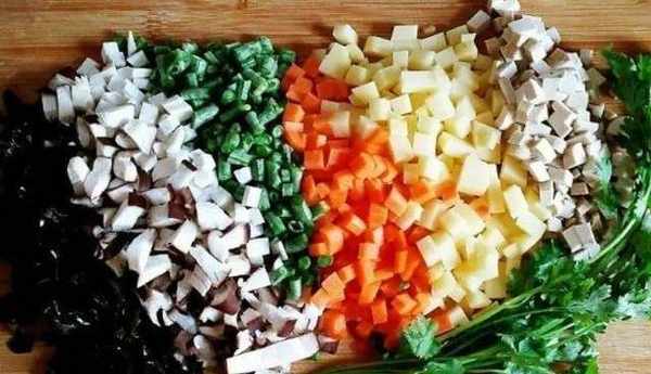 2、木耳提前泡發洗凈,土豆、胡蘿卜、豆腐洗凈切段,大蒜洗凈後切碎。