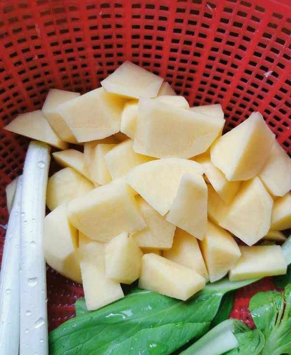 燉鴨肉的配菜可以用土豆,蘿卜都是可以的。土豆切成滾刀塊,用清水洗凈淀粉,放一邊備用。