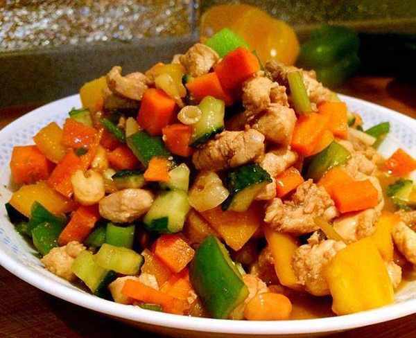 炸花生、雞胸肉、花椒、胡蘿卜、黃瓜、生抽、料酒、鹽、蔥、薑、蒜