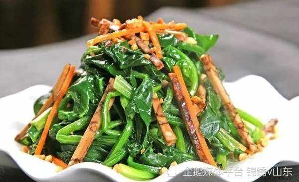 食材:菠菜、豆腐幹、白砂糖、蒜瓣、生薑、食鹽、陳醋、雞精、生抽、老抽