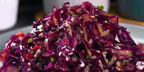 3、現在紫甘藍已經過水瞭,撈出來倒入清水裡洗一下,撈出來瀝幹水,然後用手把水擦幹。然後將紫甘藍放入鍋中,加入切碎的黃瓜、蒜末、辣小米和白芝麻。用熱油淋上它們,以散發出它們的香氣。然後加入生抽、香醋和芝麻油。不需要加鹽,可以加一勺糖,拌勻即可食用。