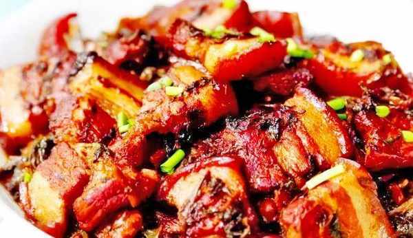 1、五花肉切成麻將塊;將幹菜浸泡在熱水中發酵。