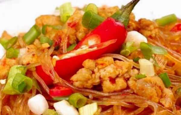 3、攪拌均勻後加入粉絲和水,用文火煮至湯收幹即可起鍋。上菜時,撒上辣椒粉和細香蔥。
