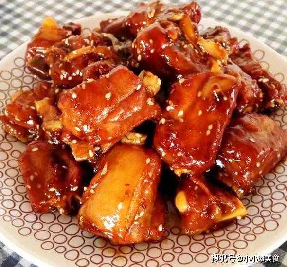 6.加入開水淹沒排骨(冷水會使肉稍微收縮,難以入味),然後加入生抽和老抽。煮沸後,轉小火燉20-30分鐘。待鍋內湯汁剩1/3時,加入鹽,大火收汁。期間不斷攪拌,使湯汁均勻地塗在排骨表面。取出裝盤,一道香脆的金紅色烤排骨就做好瞭。