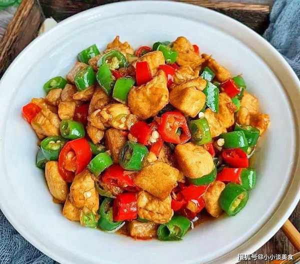 原料:雞丁250克,青紅椒50克,花椒5克,五明50克,泡椒粉;