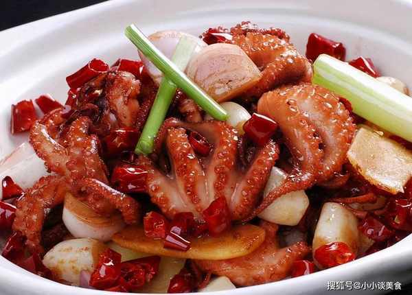 材料:章魚、鹽、辣椒粉、孜然粉、料酒、蒸魚醬油、幹辣椒、油、蔥、薑、蒜、香菜