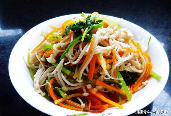 金針菇80克、黃瓜50克、胡蘿卜25克、熟芝麻適量、油適量、鹽適量、細白糖適量、白醋適量、芝麻1茶匙油,香油1/4勺。