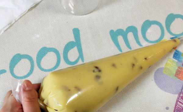 6、找一個杯子套入裱花袋,把面糊裝進去,裝好以後稍微搖晃一下,讓面糊更均勻。