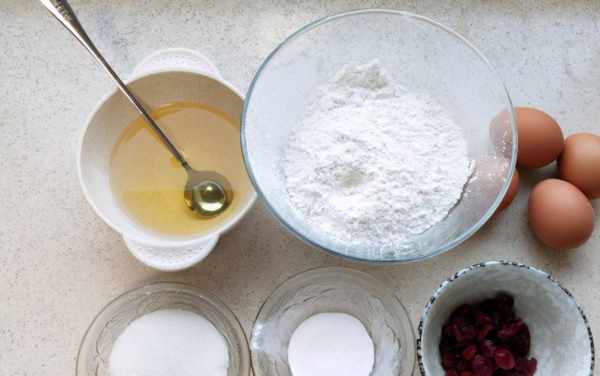 [所需菜品]:低筋面粉200克,雞蛋4個,細砂糖60克,玉米油120克,泡打粉6克,蔓越莓30克。