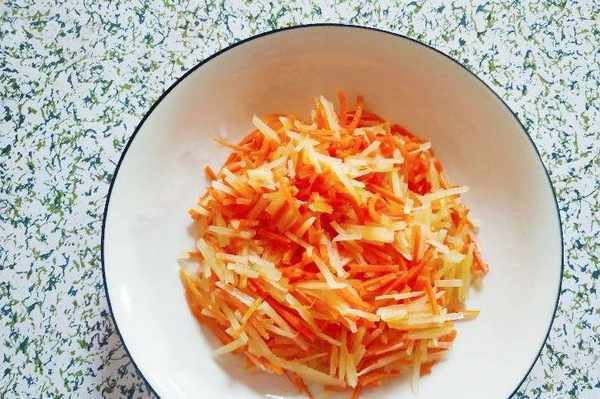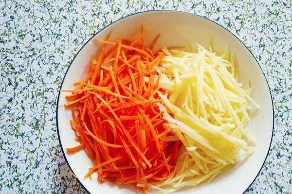 2)胡蘿卜洗凈用刨子刨成絲;土豆去皮洗凈,然後再用刨子刨成絲;土豆易氧化,如果不立馬吃的話可以泡入水中,這樣不會發黑。
