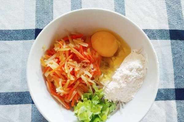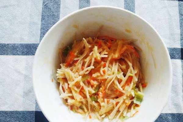 6)我們把雞蛋打入胡蘿卜絲土豆絲中,放入粉條,再加入1勺面粉、蔥花、食用鹽、生抽。(大傢可以加自己喜歡吃的任意調料)