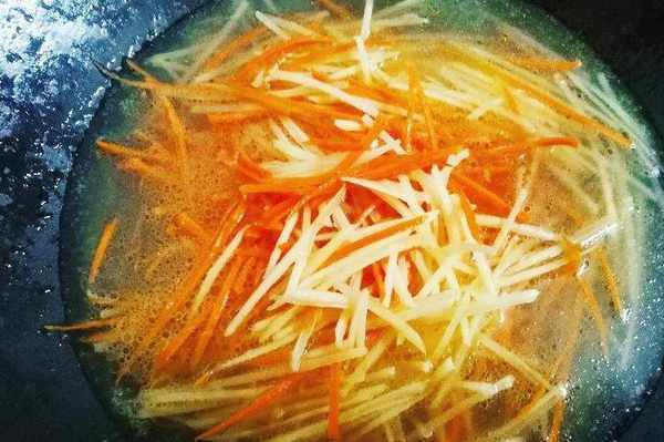 3)鍋中燒水,水開後加1勺鹽和1勺油,然後倒入胡蘿卜絲和土豆絲焯水,約1分鐘半就可以撈出,過冷水,瀝幹水分備用。