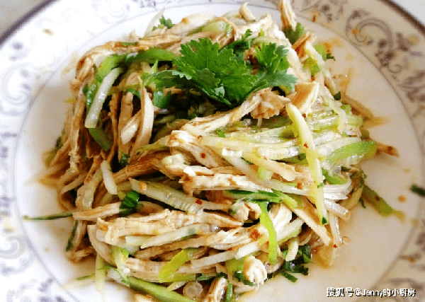 雞絲、黃瓜絲、香菜段、青椒放在一起,再放入蒜末、蔥花、鹽、生抽、蠔油、薑粉、雞精、辣椒油攪拌均勻,這道減肥餐就做好瞭。