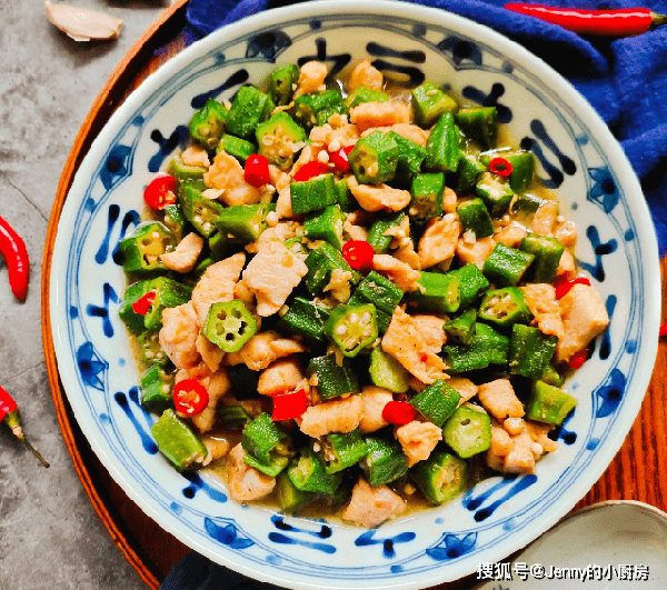 接著倒入秋葵翻炒片刻,最後加鹽調味,這道菜就做好瞭。