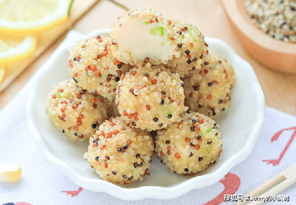 藜麥泡好後撈出瀝幹水分。取餡料團成丸子,再裹滿藜麥,放進盤內。