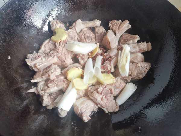 第三步:鍋裏放入花生油燒熱,倒入焯水的鴨塊煸炒,炒至鴨皮微微冒油,放入葱段薑片,花椒大料炒勻。