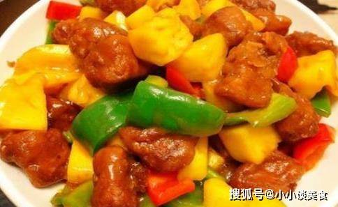 11、將炒好的肉放入鍋中,均勻地淋上醬汁。加入切碎的青紅椒和菠蘿,炒香。最後,就在上菜之前,在盤子的邊上倒一點醋。