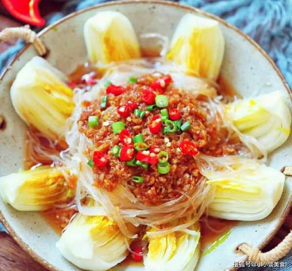 2.先把粉絲泡在熱水裡,然後把粉絲放在有娃娃菜的盤子中間備用。