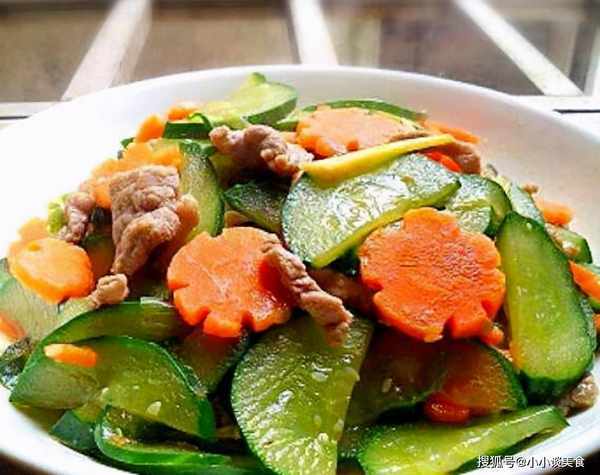 2、將豬肉放入鍋中用熱油炸熟,加入一勺料酒,用生抽炒熟,然後放入胡蘿卜,加鹽炒至胡蘿卜半熟,加入。炒黃瓜,加少許水一起炒,最後加入蔥花,拌勻後出鍋。