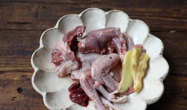 3.乳鴿去皮和多餘的油脂,頭尾切掉,一隻乳鴿可以分成4-6大塊,剁成塊備用,生薑切片。