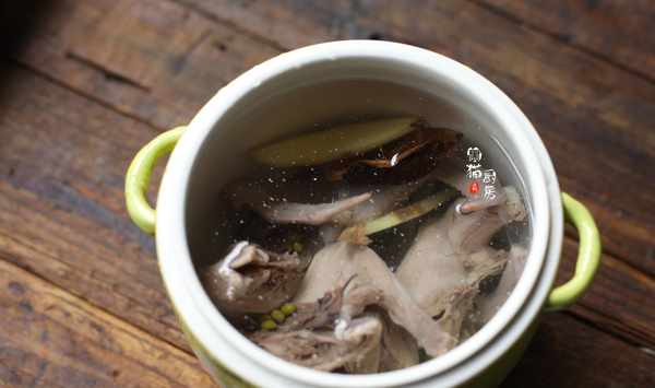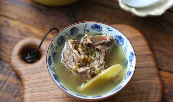 【綠豆煲乳鴿湯】食材:綠豆100克,乳鴿1隻,生薑1塊,陳皮1塊,鹽2克。
