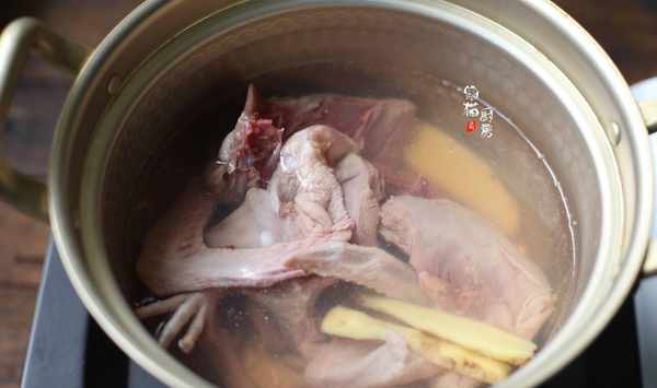 4.把乳鴿放入清水中,加入薑片,煲湯前都要把生肉類用汆燙的辦法,去掉血水和雜質以及浮沫。