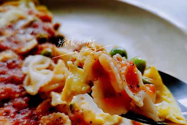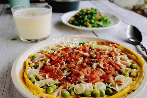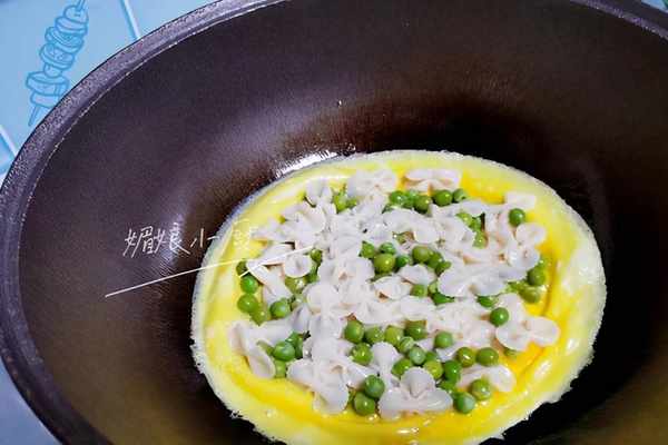 3、此時蛋液底部略微定型,而表面蛋液並未凝固,將煮熟的豌豆仁和蝴蝶面鋪在蛋餅上,用勺子底輕輕地壓一壓,好讓豌豆仁和蝴蝶面粘牢在還未完全凝固的蛋液上